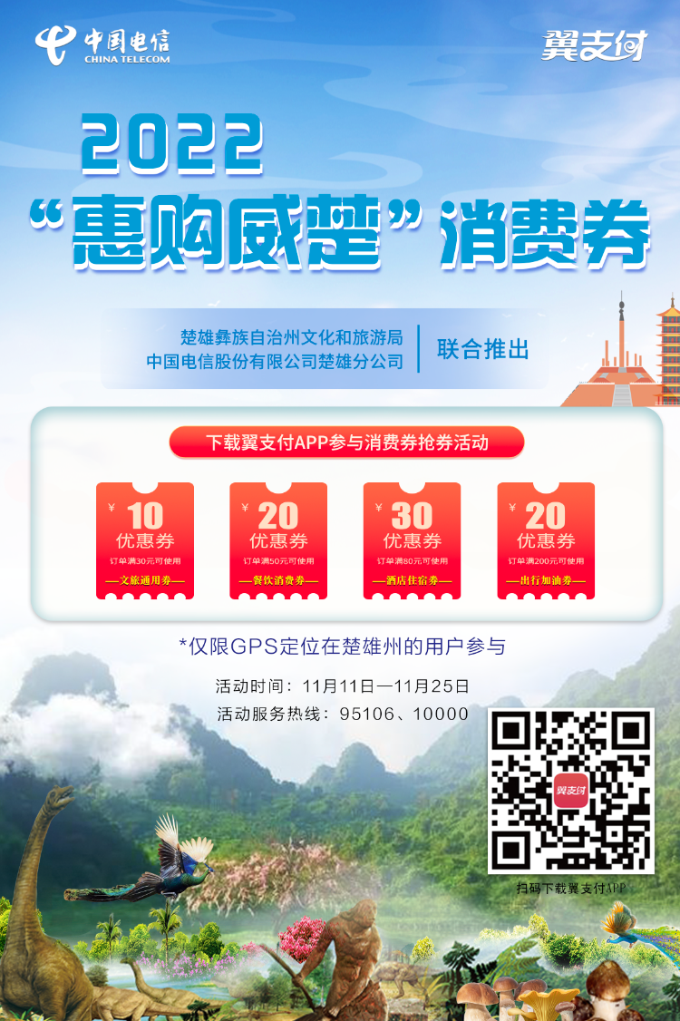 此次活动由det365下载_bt365登录_华为怎么进BT365文化和旅游局、中国电信股份有限公司楚雄分公司联合推出,借助翼支付互联网平台发放数字消费券,促进消费回流和潜力释放,助力文旅企业纾困解难。“威楚消费券”总预算为50万元,分为2批次投放,每批次投放25万元。第一批于2022年11月11日10:00投放,第二批预计2022年11月25日10:00投放。发放平台为翼支付客户端,发放对象为GPS定位在det365下载_bt365登录_华为怎么进BT365内的所有消费者,包含文旅通用券(满30减10)、餐饮消费券(满50减20)、酒店住宿券(满80减30)、加油券(满200减20)等满减活动,用于消费券指定合作的商户(含景区、酒店和餐饮等)使用。