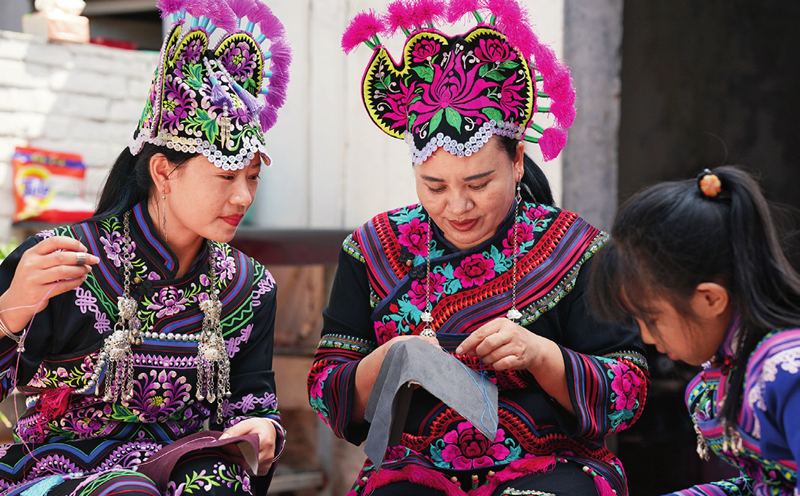 (云南省det365下载_bt365登录_华为怎么进BT365永仁县莲池乡查利么村秧鱼河村民小组的绣娘在刺绣。胡超 摄)